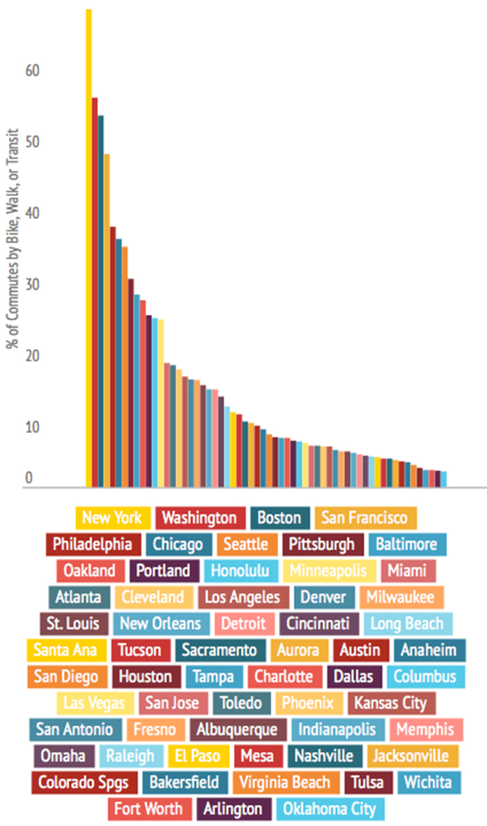 New York, not surprisingly, has the highest share of non-car commuters (67 percent):